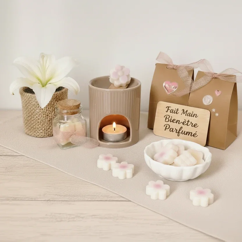 - Choisissez votre option : fondants seuls ou avec brûle-parfum en céramique (blanc ou taupe)